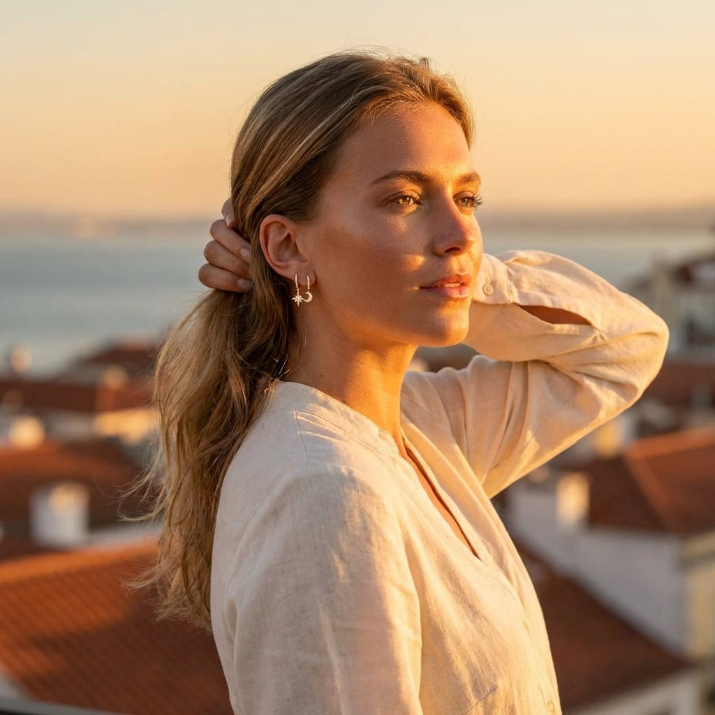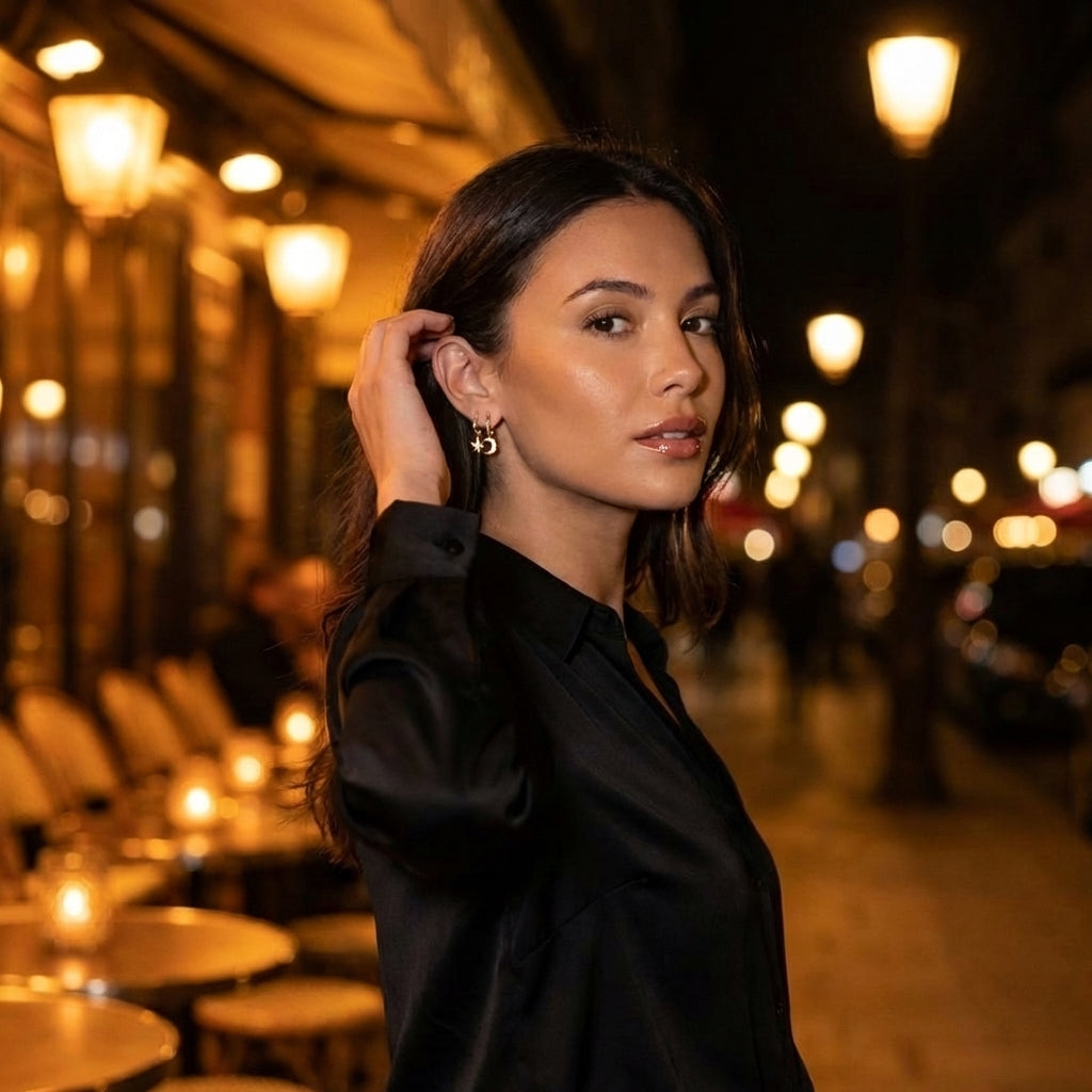 Les boucles d'oreilles Celeste Lune et Étoile apportent une touche de magie céleste à votre collection de bijoux du quotidien. Ornées de délicates breloques pendantes en forme de croissant de lune et d'étoile scintillante, ces boucles d'oreilles créent un look onirique, à la fois ludique et élégant.