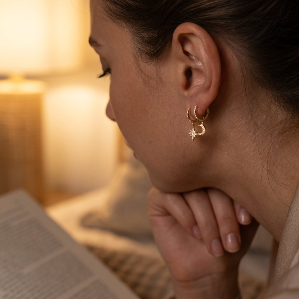 Fabriquées en acier inoxydable 316L de première qualité et revêtues d' un placage PVD or 18 carats , les créoles Celeste Lune et Étoile sont conçues pour une durabilité et un éclat exceptionnels. Le revêtement PVD de pointe offre une finition dorée plus épaisse et plus résistante qu'un plaquage traditionnel.