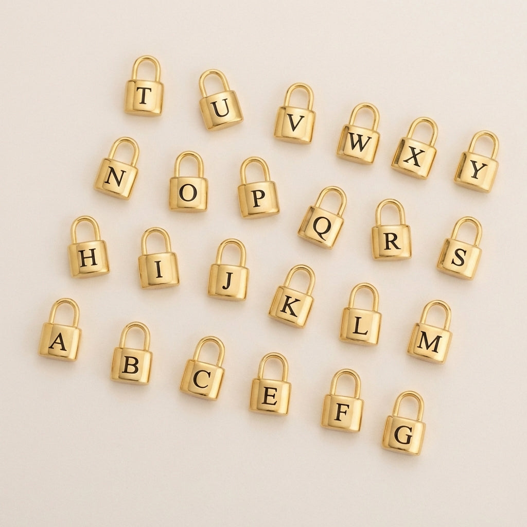 The Valora Lock Initial Necklace blends symbolism with modern minimal design. Featuring a polished lock pendant engraved with your chosen initial, this piece represents connection, loyalty and self love. Clean lines and a smooth gold finish give it that effortless luxury feel that works from everyday basics to evening layers.